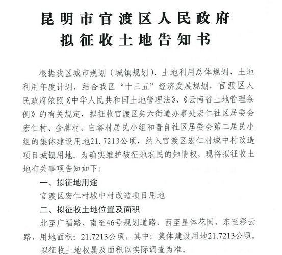 近日,昆明市國土資源局官渡分局發布了關于“官渡區宏仁村城中村改造項目擬征收土地”的告知書,據公告,官渡區將征收宏仁村、金牌村、白塔村以及普自社區第二居民小組共計325畝的土地,征地補償為25萬元/畝。