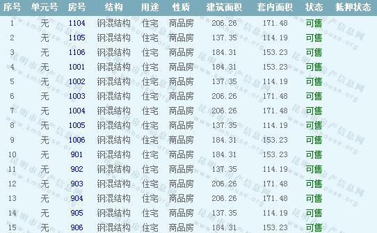 依據《云南省商品房銷售明碼標價實施細則》,商品房經營者應當在商品房交易(銷售)場所的醒目位置放置標價牌、價目表或者價格手冊,有條件的可同時采取電子信息屏、多媒體終端或電腦查詢等方式。商品房銷售明碼標價應當做到價目齊全,標價(示)內容真實明確、字跡清晰、標示醒目,并標示價格主管部門12358投訴舉報電話。人民路壹號廣場一期準售房源信息如下: