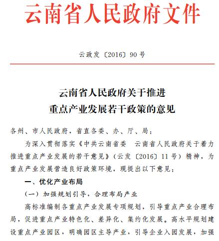 近日,云南省人民政府發(fā)布了關(guān)于“推進(jìn)重點產(chǎn)業(yè)發(fā)展若干政策的意見”,為重點產(chǎn)業(yè)發(fā)展?fàn)I造良好政策環(huán)境提出了優(yōu)化產(chǎn)業(yè)布局、提高創(chuàng)新驅(qū)動能力、深化關(guān)鍵領(lǐng)域、加強(qiáng)主體和載體培育、培育壯大民營經(jīng)濟(jì)、有效降低企業(yè)成本、加大財政金融、加強(qiáng)人才培養(yǎng)、增強(qiáng)服務(wù)保障能力支持等9條共25點意見,具體政策原文如下: