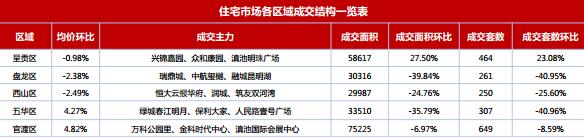 本周全市商品住宅成交除呈貢區(qū)逆勢上漲27.50%以外,其余各區(qū)均有所下降,其中盤龍區(qū)跌幅達39.84%。本周全市商品住宅成交均價呈貢區(qū)、盤龍區(qū)及西山區(qū)出現(xiàn)下跌,官渡區(qū)、五華區(qū)分別上漲4.82%及4.27%。