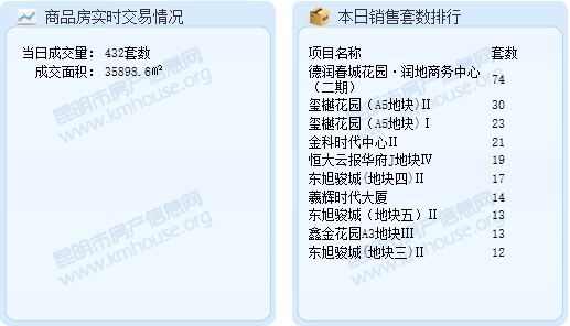 截至11月2日23:33,昆明市房產(chǎn)信息網(wǎng)成交數(shù)據(jù)顯示,2016年11月2日昆明成交商品房套數(shù)為432套。較之昨天的602套,減少了170套;成交面積35898.6平米。今日成交套數(shù)排行前三的項(xiàng)目分別是:德潤(rùn)春城花園·潤(rùn)地商務(wù)中心(二期):74套;璽樾花園(A5地塊)II:30套;璽樾花園(A5地塊)I:23套。成交面積排行前三的項(xiàng)目分別是:璽樾花園(A5地塊)II,成交面積:3581㎡;德潤(rùn)春城花園·潤(rùn)地商務(wù)中心(二期),成交面積:2487.89㎡;璽樾花園(A5地塊)I,成交面積:2425.49㎡。
