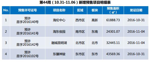 注:本周東驤神駿和融城昆明湖的預售為重復供應,故本周實際新增預售為2個,預售面積8.62萬方。