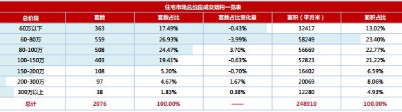 本周全市商品房成交集中于60-150萬之間,其中60-80萬占比26.93%、 80-100萬占比24.47%、 100-150萬占比19.41%,各總價段成交變化不大,市場平穩。