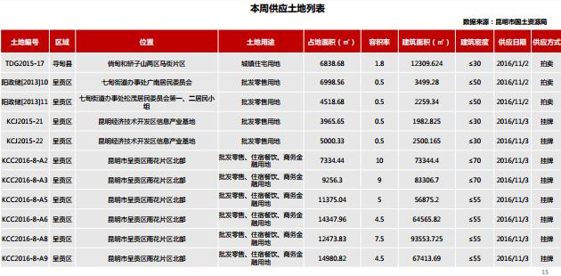 本周土地供應22宗,分別位于呈貢區、西山區以及尋甸縣,土地用途包含工業用地、批發零售、住宿餐飲、商務金融用地,城鎮住宅用地。本周土地無成交。