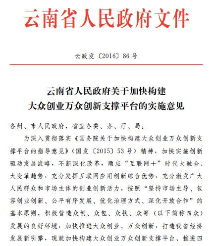 云南省人民政府關(guān)于加快構(gòu)建大眾創(chuàng)業(yè)萬眾創(chuàng)新支撐平臺的實施意見