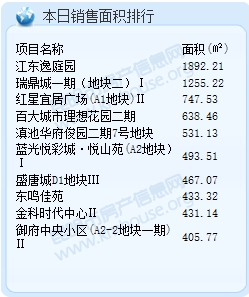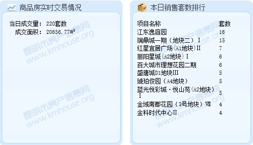 截至11月16日23:47,據昆明市房產信息網成交數據顯示,2016年11月16日昆明成交商品房套數為220套。較之昨天的376套,減少了156套;成交面積20656.77平米。今日成交套數排行前三的項目分別是:江東逸庭園:16套;瑞鼎城一期(地塊二)I:15套;紅星宜居廣場(A1地塊)II:7套。成交面積排行前三的項目分別是:江東逸庭園,成交面積:1892.21㎡;瑞鼎城一期(地塊二)I,成交面積:1255.22㎡;紅星宜居廣場(A1地塊)II,成交面積:747.53㎡。