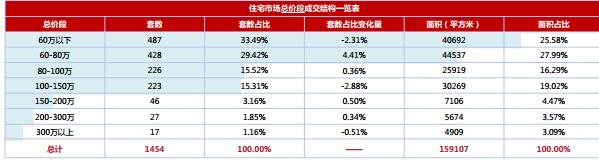 本周全市商品房成交集中于60萬以下、 60-80萬兩個總價段,其中60萬以下占比33.49%,60-80萬占比29.42%,各總價段成交變化不大.
