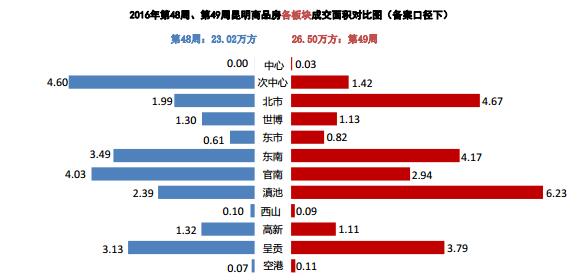 本周商品房成交前三板塊為:滇池、北市和東南,成交面積分別為6.23萬方、4.67萬方和4.17萬方。