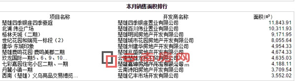 截至2016年11月30日23:00,根據楚雄房產信息網的統計,2016年11月楚雄商品房的銷售套數、面積各十強的排行榜單出爐。根據榜單可知,銷售套數排行前三的項目分別是:北浦·偉業廣場,成交商品房138套;西南(楚雄)義烏商品交易博覽城,成交商品房109套;楚雄四季銀座四季豪庭,成交商品房104套。銷售面積排行前三的項目分別是:楚雄四季銀座四季豪庭,成交面積為11843.91平米;北浦·偉業廣場,成交面積:10311.93平米;格林天城(二期)成交面積為9171.95平米。