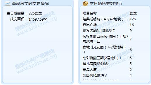 截至2017年1月1日23:00,據(jù)昆明市房產(chǎn)信息網(wǎng)成交數(shù)據(jù)顯示,2017年1月1日昆明商品房成交套數(shù)為255套。較之昨天的639套,減少可438套;成交面積14697.59平米。今日成交套數(shù)排行前三的項目分別是:經(jīng)典成明苑(A1/A2地塊),成交126套,霖嵐廣場,成交16套,俊發(fā)名城N-15地塊Ⅰ,成交9套。成交面積排行前三的項目分別是:經(jīng)典成明苑(A1/A2地塊),成交4897.62平米,霖嵐廣場,成交1236.84平米,俊發(fā)名城N-15地塊Ⅰ,成交968.09平米。