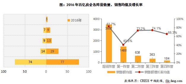 2016年,在業績高速增長的刺激下,百億企業發展格局發生較大變化:131家百億房企的銷售額分布明顯分為五個陣營(3000億以上、1000-3000億元、500-1000億元、300-500億元、100-300億元),企業數量分別為3家、9家、13家、29家和77家,各陣營企業數量均較上年有所增加,部分企業銷售業績翻番,規模再上新臺階,實現陣營升級甚至跨越升級;規模效應加速發酵,強者恒強態勢凸顯,3000億元以上的超級陣營脫穎而出,恒大、萬科、碧桂園寡頭壟斷特征加劇,3家房企市場份額已近10%。總的來看,行業集中度已加速提升,百億企業在業績快速增長的同時亦充滿危機感,力求及時搭乘此輪上漲行情的順風車,鞏固行業地位,企業間競爭更趨激烈。其中,不同陣營的企業具有特色鮮明的差異化發展特點和成長路徑: