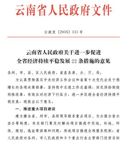 12月30日,云南省人民政府下發了《關于進一步促進全省經濟持續平穩發展22條措施的意見》,對城市重大項目建設、城市基礎設施投入、民間投資、繼續實施社保優惠政策、促進住房消費等內容提出了實施意見。其中第十條“降低企業用地成本”中提到,將繼續采取動工、置換、收回等有力方式,大力處置2016年專項行動清理的閑置土地,收回的閑置土地優先用于民生及重點工程項目建設;十六條促進住房消費中提出,將推行保障房建設“以購代建”“以租代建”政策,全面開展住房公積金異地個人住房貸款業務,把適合作為公租房或經過改造符合公租房條件的存量商品房,轉為公租房、房地產項目未預售的,房地產開發企業可申請調整商住比例等內容。