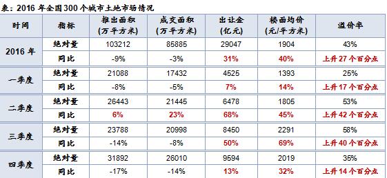 據(jù)中指院研究數(shù)據(jù):2016年,全國300城市土地供需小幅下降,重點城市成交活躍帶動地價及溢價率上揚,出讓金較去年增加三成。一季度受年初淡季及春節(jié)假期影響,供需各項指標均處低位;二三季度熱點城市發(fā)力,在一線供地有限、成交回落的情況下,二線重點城市成為房企競逐熱點,地價與出讓金漲幅較顯著;四季度多地發(fā)布新政穩(wěn)定市場,重點城市由火熱趨向理性,出讓金同比漲幅收窄。