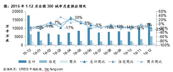 2016年12月,全國300個城市共推出土3339宗,推出土地面積13296萬平方米,環(huán)比增加27%,同比減少25%。其中,住宅類用地(含住宅用地及包含住宅用地的綜合性用地)1151宗,推出土地面積5374萬平方米,環(huán)比增加50%,同比減少18%;商辦類用地609宗,推出土地面積1575萬平方米,環(huán)比增加1%,同比減少30%。