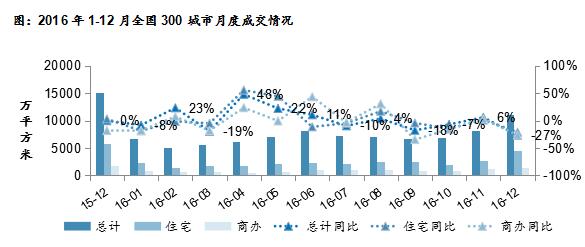 2016年12月,全國300個城市共成交土地2746宗,成交面積11054萬平方米,環(huán)比增加36%,同比減少27%。其中,住宅用地(含住宅用地及包含住宅用地的綜合性用地)926宗,成交面積4576萬平方米,環(huán)比增加73%,同比減少21%;商辦類用地514宗,成交土地面積1383萬平方米,環(huán)比增加11%,同比減少26%。