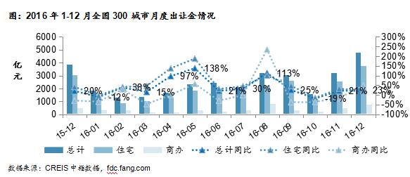 2016年12月,全國300個城市土地出讓金總額為4790億元,環(huán)比增加49%,同比增加23%。其中,住宅類用地(含住宅用地及包含住宅用地的綜合性用地)出讓金總額為3758億元,環(huán)比增加48%,同比增加22%;商辦類用地出讓金總額為780億元,環(huán)比增加64%,同比增加50%。