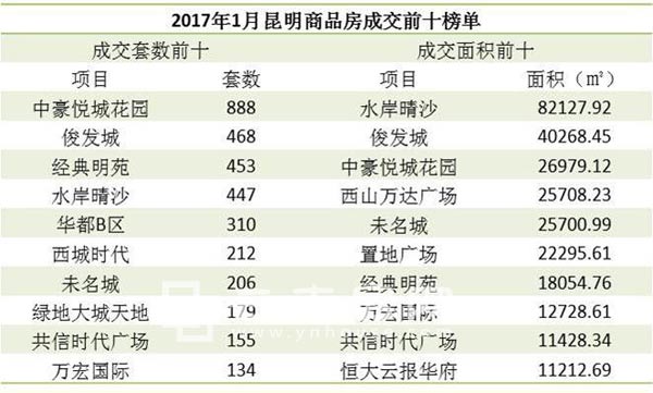 根據有成交紀錄的項目統計,1月昆明成交套數最多的項目是中豪悅城花園,該項目一個月內累計備案了888套商品房。俊發城成交468套排名第二,經典明苑成交453套排在第三位。水岸晴沙成交447套排名第四。斬獲榜單第五名的是華都B區,成交套數為310套。