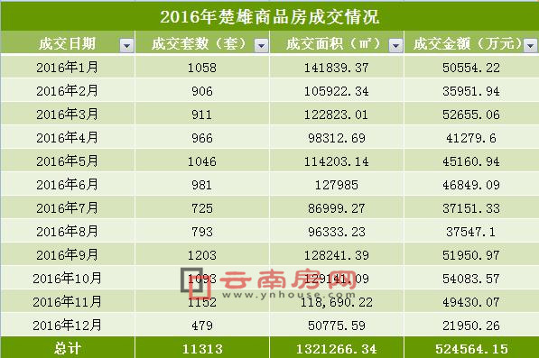 根據(jù)楚雄房產(chǎn)信息網(wǎng)的數(shù)據(jù),2016年楚雄成交備案商品房11313套,成交面積為1321266.34平米,成交金額達524564.15萬元,年成交均價為3970元/平米。在2016年楚雄商品房成交數(shù)據(jù)中,月成交最高套數(shù)的是9月,成交了1203套;面積成交最多的是1月,成交了141839.37平米;反之,月成交套數(shù)、面積最少的是12月,成交值為479套、50775.59平米。2016年月均成交套數(shù)為943套,月均成交面積達110105.53平米。