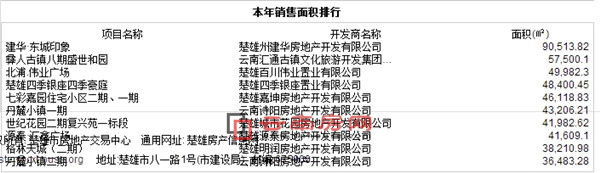 截止2016年12月30日(因31日楚雄房產(chǎn)信息網(wǎng)出現(xiàn)故障)晚間,根據(jù)楚雄房產(chǎn)信息網(wǎng)的統(tǒng)計,2016年楚雄商品房銷售套數(shù)偏排行前三的項目分別為:西南楚雄義烏商品交易博覽城,售出707套;彝人古鎮(zhèn)八期盛世和園,售出609套;丹麓小鎮(zhèn)一期,售出536套。年銷售面積排行前三的項目分別是:建華·東城印象,成交90513.82平米;彝人古鎮(zhèn)八期盛世和園,成交57500.1平米;北浦·偉業(yè)廣場,成交49982.3平米。