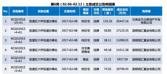 成交土地均位于官渡區(qū)六甲街道辦事處,共6宗。其中宗地編號為KCGD2016-25-A1的1宗土地由云南金萬眾房地產開發(fā)有限公司競得,成交樓面地價為1994.97元/㎡,成交單價為266萬元/畝。據了解,此次拿地的云南金萬眾房地產開發(fā)有限公司為金科地產集團股份有限公司與昆明金岑置業(yè)有限公司共同出資成立的子公司,這也意味著金科在昆第二項目成功落地。