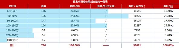 本周全市商品房成交集中于60萬以下、60-80萬、100-150萬三個總價段,分別占整周成交套數的20.85%、24.62%及20.60%,由于上周成交量過少,無法進行比較。