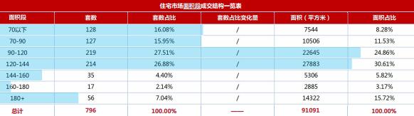 本周成交集中于90-120㎡、120-144㎡兩個面積段,分別占全周成交套數的27.51%、26.88%,可以看出剛需、首改型產品是市場的主力面積段。