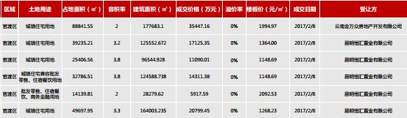 本周昆明主城四區及呈貢區商住辦土地成交6宗,占地面積25.01萬方,建筑面積71.67萬方,均位于官渡區。其中金科以3.54億元摘獲一宗住宅用地,而恒大則以6.92億競得剩余5宗地塊,6宗土地共成交104691萬元.