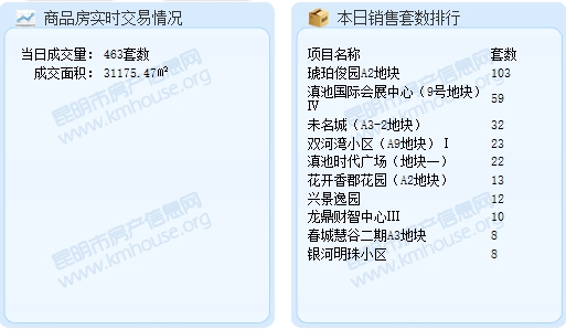 截至2月22日23:20,據昆明市房產信息網成交數據顯示,2017年2月22日昆明成交商品房套數為463套。較之昨天的419套,增加了44套;成交面積31175.47平米。今日成交套數排行前三的項目分別是:琥珀俊園A2地塊:103套;滇池國際會展中心(9號地塊)IV:59套;未名城(A3-2地塊):32套。成交面積排行前三的項目分別是:琥珀俊園A2地塊,成交面積:3087.27㎡;雙河灣小區(A9地塊)I,成交面積:2439.68㎡;滇池時代廣場(地塊一),成交面積:2088.83㎡。