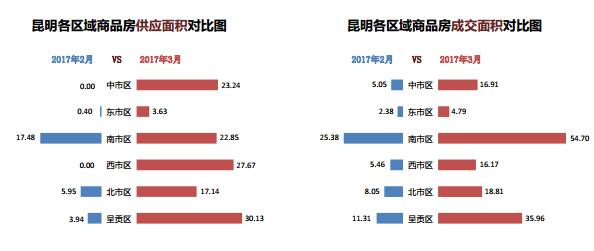 本月各區域均有供應,其中呈貢區供應面積最大,為30.13萬方;本月各區域成交均成倍增長,漲幅在100%-250%之間,其中中市區漲幅最大,為234.65%。