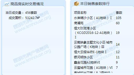 截至5月8日23:46,據昆明市房產信息網成交數據顯示,2017年5月8日昆明成交商品房套數為456套,成交面積53242.7平米。今日成交套數排行前三的項目分別是:水岸晴沙小區:105套;倚瀾苑:60套;恒大玖瓏灣:19套。成交面積排行前三的項目分別是:水岸晴沙小區,成交面積:15448.15㎡;倚瀾苑,成交面積:10928.16㎡;恒大玖瓏灣,成交面積:2212.52㎡。