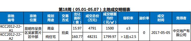 本周昆明市土地成交2宗,均位于昆明市呈貢區吳家營片區中部,被中交地產有限公司競得。 中房地產股份有限公司于5月5日發布公告透露,該公司與中交地產有限公司、昆明眾垚建設項目管理合伙企業(有限合伙)組成聯合體,共同競得云南省昆明市呈貢區吳家營片區中部編號為KCC2012-22-A1、 KCC2012-22-A2兩宗地塊的國有建設用地使用權,意味著中交建正式以二級開發商身份實現首次進入昆明房地產市場。 聯合體中,中房地產權益比例為73%,中交地產有限公司權益比例為19%,昆明眾垚建設項目管理合伙企業(有限合伙)權益比例為8%。