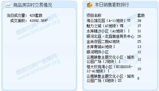 截至5月12日23:00,根據昆明市房產信息網數據,2017年5月12日昆明成交商品房成交429套,成交面積41692平米。今日成交套數排行前三的項目分別是:東旭駿城海公館花園(A-11地塊):39套;魅力之城(A7地塊):37套;水岸晴沙小區(A1地塊):31套。