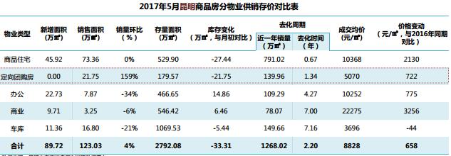 土地供銷價:截止2017年5月31日,昆明土地除卻工業用地外成交總金額達97.84億。2、3月份因受春節影響,基本無土地供應,4月份供應871畝,達到正常水平,本月更是加大了供應量,達1663.89畝,環比增長91.02%,同比增長532.13%;3、4月份土地經過1、2月份的大量成交后陷入了暫時沉寂,因此本月成交521.52畝,環比增長32倍,同比增長675.36%;樓面價為1637元/㎡,同比下降64.30%;成交單價316.53萬元/畝;皆處于正常水平。