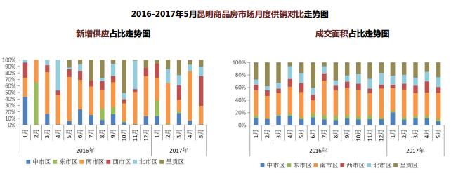 南市區供應占比大幅下降,西市區供應占比大幅增長;中市區和西市區成交占比下降,呈貢區及南市區小幅增長,東市區環比持平.