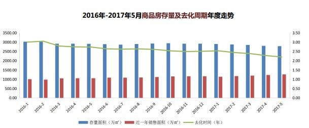 昆明2016-2017年5月商品房存量及去化周期月度走勢:2016年至今,去化周期呈緩慢下降趨勢,呈現良好的去庫存態勢,按目前去化速度,需2.20年去化.