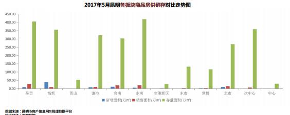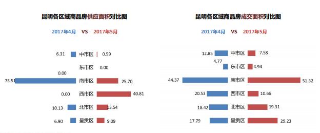 昆明2017年4月與2017年5月商品房區域月度供銷對比:本月除東市區無供應外其他各區域均有供應,其中西市區供應面積最大,為40.81萬方;本月除西市區及中市區成交小幅下降外,其余區域均有不同程度增長,其中南市區漲幅較大,達15.66%。