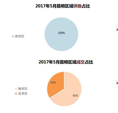 各區域供銷對比: 5月僅西市區有供應,共供應28宗,面積1663.89畝; 5月南市區和呈貢區有土地成交,其中南市區成交5宗,面