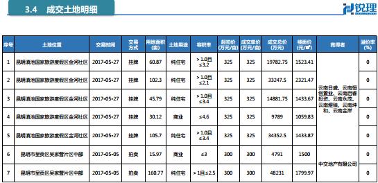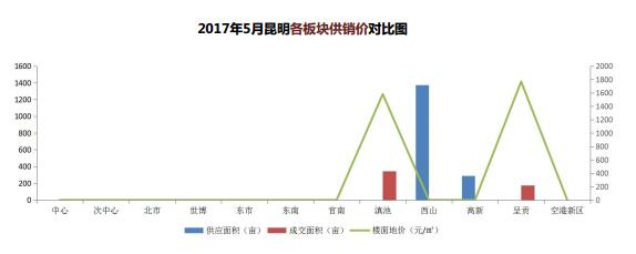 區域、板塊:本月西山和高新板塊有土地供應,分別為1375.38和288.51畝;滇池和呈貢板塊有成交,其中滇池板塊成交344.78畝,樓面價1581元/㎡,呈貢板塊成交176.74畝,樓面價1768元/㎡。土地出讓金: 相較于3、4月份,本月成交金額大大提高,達16.51億元,呈5.5倍態勢增長。土地溢價、流拍:本月無土地溢價,無土地流拍。