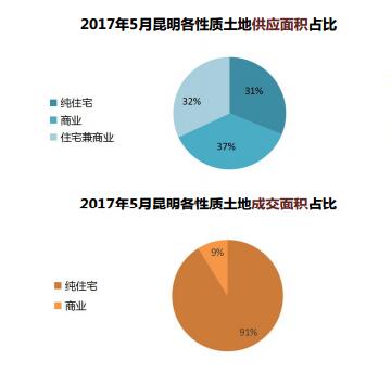 5月昆明純住宅用地供應12宗,約518.15畝,供應面積占比31%;5月昆明商業用地供應6宗,約613.5畝,供應面積占比37%;5月住宅兼容商業用地供應10宗,約532.24畝,供應面積占比32%。
