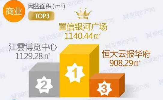 其中,商業賣得最好的是置信銀河廣場,成交面積為1140.44平方米。排名第二的是斗南江雲酒店用品博覽中心,成交面積為1129.28平方米。恒大云報華府排第三位,成交面積為908.29平方米。