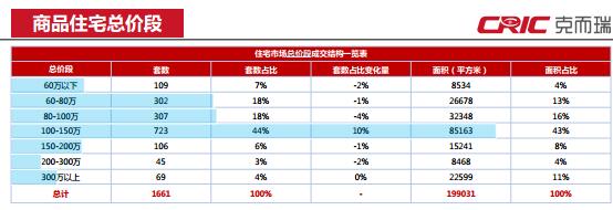 本周全市商品房成交集中亍100-150萬總價段區間,共占整周成交套數癿44%,較上周增長10%,其他各總價段成交套數占比均有輕微下降。