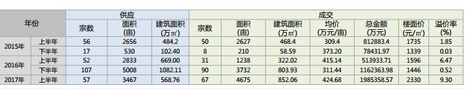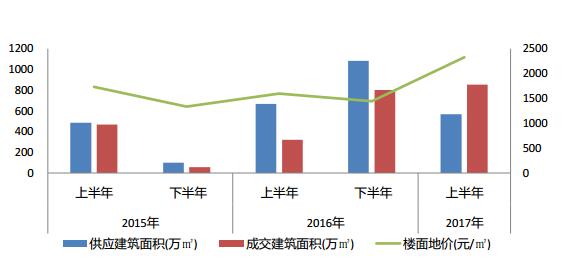 2017年上半年純住宅用地供應1952畝,占比56%;成交2701畝,占比58%,單價421萬元/畝。住宅兼容商業性質的地價最高,為608萬元/畝。