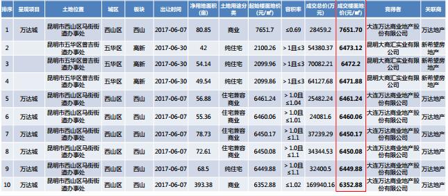 【 成交樓面地價TOP10】 2017年上半年成交樓面地價前十中7宗由萬達地產競得,3宗由新希望地產競得,最高樓面地價為7651.7元/㎡。