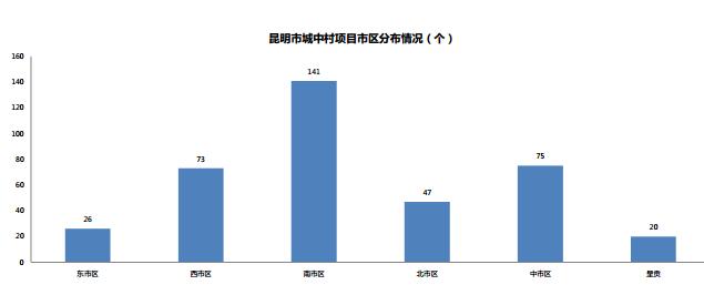 城中村分布:截止2015年底,全昆明市共有382個城中村被列入改造;從區域數據來看,昆明市城中村主要集中于南市區(141個)、中市區(75個)、西市區(73個),前三名占比達76.65%。