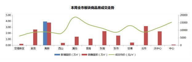 本周成交主力為高新板塊,其成交總量占板塊成交量的19.27%,其次為北市板塊和呈貢板塊,成交量占板塊成交量的16.31%和13.39%;本周成交均價最高為滇池板塊,均價為18665元/㎡,華夏御府、公園1903綠地大城天地等高價項目備案拉高整體均價。