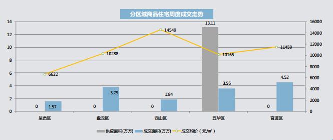 占全市成交30%,排名區域第一。其次盤龍區、五華區、西山區、呈貢區成交量分別占全市成交的25%, 23%、 12%和10%。