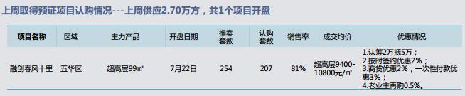 本周開盤項目1個,推出體量2.70萬方,成交2.21萬方,本周面積去化率為82%;從開盤認販率來看,本周套數去化率為81%,本周推出五華區項目1個,共推出254套,銷售207套,去化率81%。小高層81-166㎡、超高層85-99㎡以內 ,交通通達便利,戶型實用性高,周邊配套完善,品牌房企。