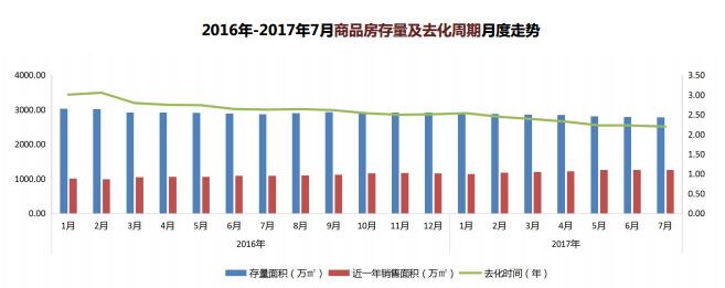 商品房存量及去化周期月度走勢:2016年至今,去化周期呈緩慢下降趨勢,呈現(xiàn)良好的去庫存態(tài)勢;截止2017年7月31日,商品房庫存2779.87萬方,按目前去化速度,需2.20年去化。