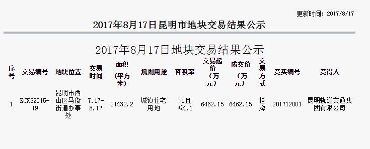 今日(8月17日),位于西山區(qū)馬街街道辦事處的的1宗住宅用地掛牌交易,面積共32.15畝,交易起價(jià)為6462.15萬元。截止到報(bào)名時(shí)間,僅有一位買家報(bào)名,最終被昆明軌道交通集團(tuán)有限公司以底價(jià)摘牌。