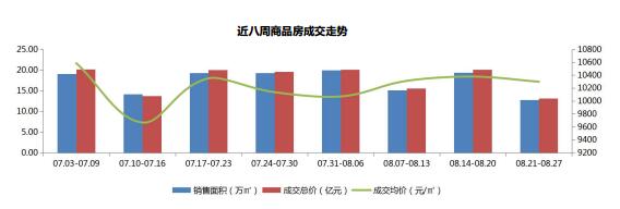 本周成交面積12.75萬㎡,環比下降32.24%;本周成交均價10299元/㎡,環比持平;本周成交金額13.13億元,環比下降34.75%,比上周減少6.99億元。